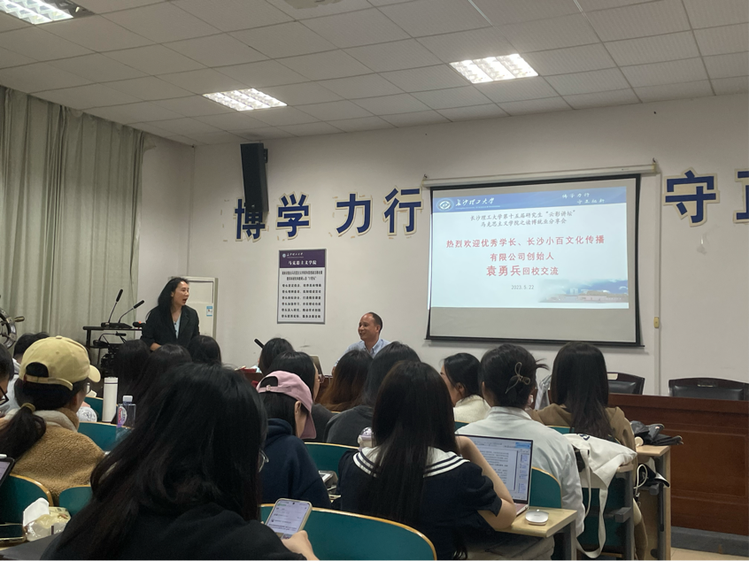 为帮助同学们在今后的生涯规划中明确目标、把握时机,伟德betvlctor1946源于英国马克思主义学院于5月22日晚八点在云塘校区文科楼C202举办第十五届研究生“云影讲坛”暨职业与人生大讲堂——读博就业分享会。本次活动由辅导员曾蓓老师主持,优秀学长、长沙小百文化传播有限公司创始人袁勇兵受邀主讲,马克思主义学院2022级全体研究生参加。