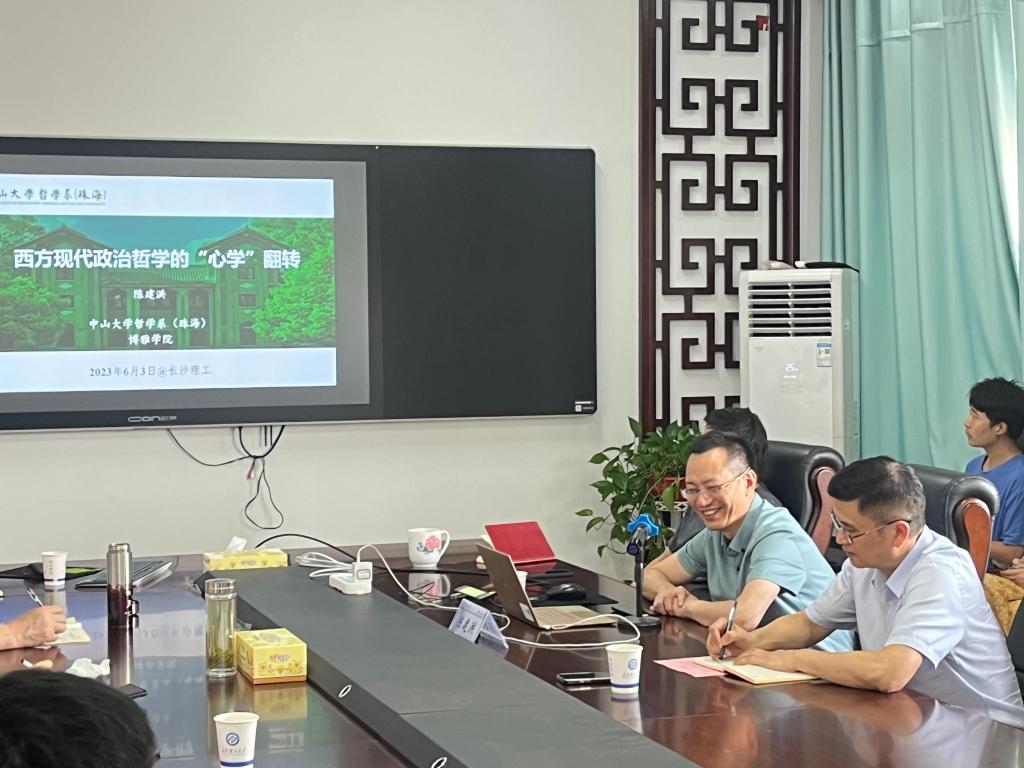 2023年6月3日下午14时,中山大学哲学系(珠海)教授兼系主任、博雅学院院长、“一带一路”研究院院长陈建洪教授应邀来到马克思主义学院,在云塘校区文科楼B602会议室作了题为“西方现代政治哲学的‘心学’翻转”的学术讲座。本次讲座由院党委书记陈万球教授主持,我院院长张明海教授,余乃忠教授、陆群教授、蒋显荣教授、邹新树副教授、谢文成副教授、文贵全副教授等学院教师和哲学专业研究生40余人参加了讲座,建筑学院易学尧副教授也前来参加了讲座。