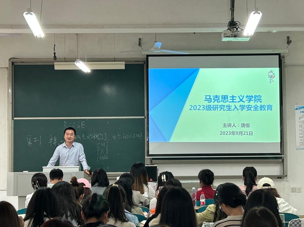 为增强同学们的安全防范意识,筑牢校园安全防线。2023年9月21日上午10:00,马克思主义学院在文科楼B303开展入学安全教育专题学习。本次学习由马克思主义学院副院长唐俊主讲,2023级全体研究生参加。