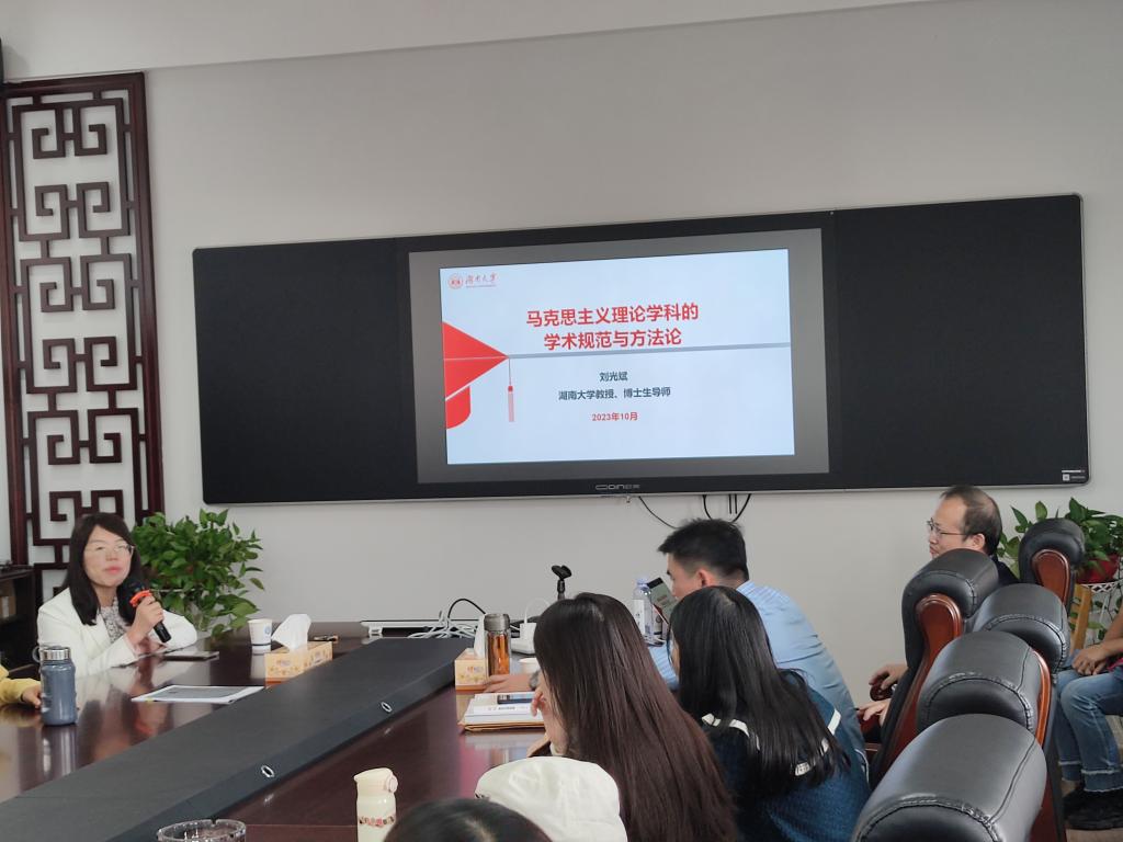 2023年10月10日下午14:00,湖南大学马克思主义学院党委副书记、纪委书记刘光斌教授应邀来到马克思主义学院讲学,在云塘校区文科楼B602会议室作了题为“马克思主义理论学科的学术规范与方法论”的专题学术讲座。马克思主义学院副院长李雨燕教授主持讲座,艾楚君教授、文贵全副教授、陈方芳博士、刘玉立博士等学院教师和2021、2022级全体马克思主义理论专业硕士研究生参加了讲座。