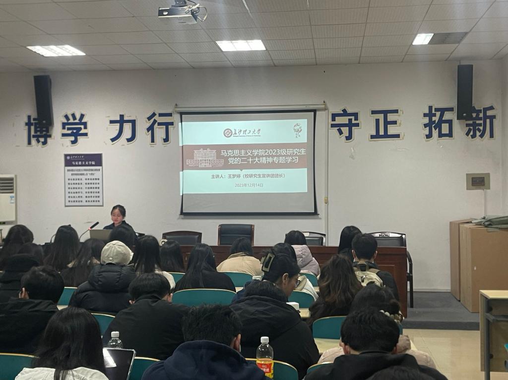 为深入学习宣传贯彻党的二十大精神,增强对学生的价值观引领,2023年12月14日晚7:00,马克思主义学院于云塘校区文科楼C202开展新生入学教育系列之党的二十大精神专题学习。本次宣讲会邀请到伟德betvlctor1946源于英国研究生宣讲团团长王梦婷进行题为《凝心聚力掣画新蓝图,团结奋斗创造历史新伟业》的宣讲,由学院辅导员曾蓓主持,2023级全体研究生参加。