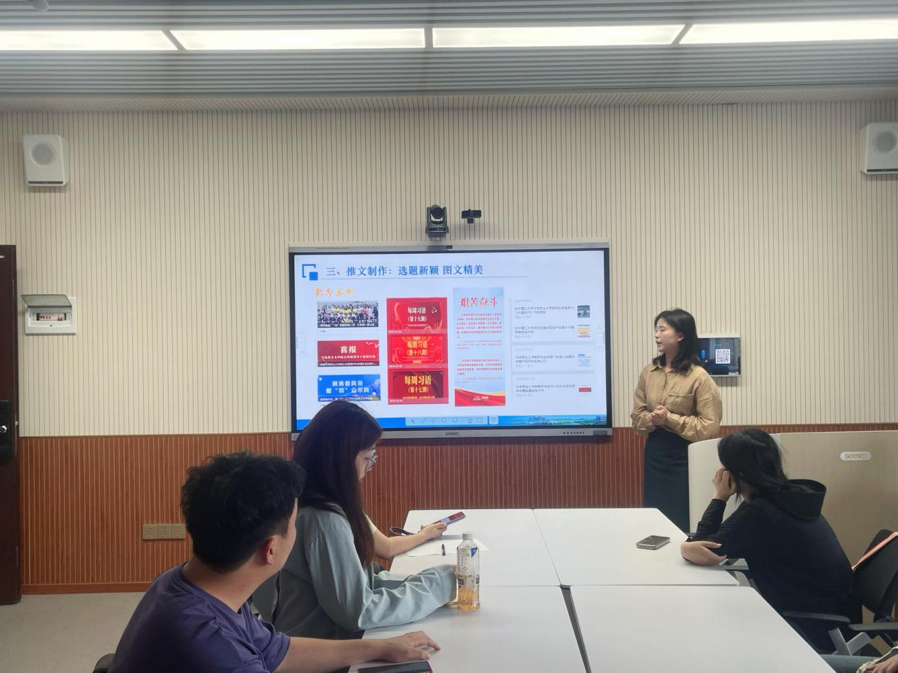 5月10日下午在文科楼A611教室,马克思主义学院组织开展新媒体运营专题培训会。本次会议由院研究生会宣传部负责人尹梦璇主持,特邀校学工部思政科老师、我院2022级研究生詹佳主讲。辅导员老师曾蓓、院研会宣传部全体成员、校研究生宣讲团宣传组织部全体成员参加了此次培训。
