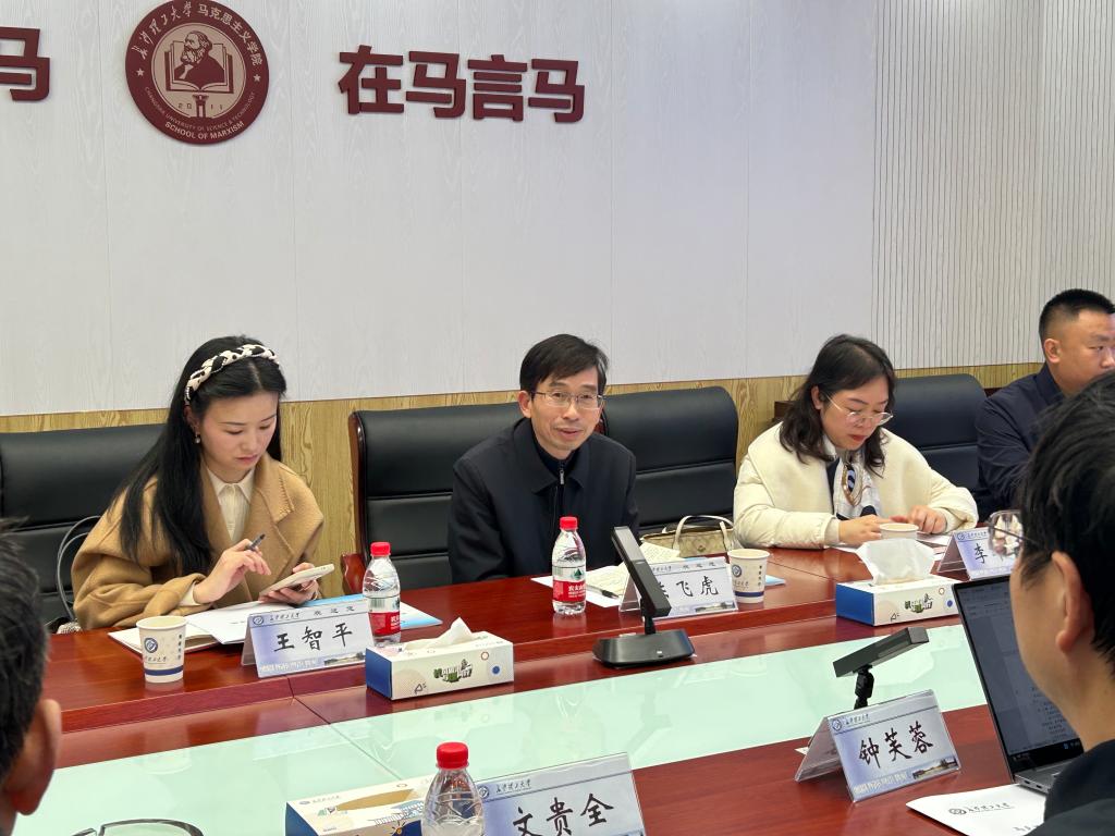 2025年3月13日上午,湖南工商大学马克思主义学院副院长陈飞虎、习近平新时代中国特色社会主义思想系主任李卓琦、马克思主义系主任王智平、智慧党史党建系主任贺治方等一行人莅临我院开展关于本科教学评估工作的调研交流。我院副院长钟芙蓉主持交流会,副院长文贵全及相关教研室负责人等参加会议。