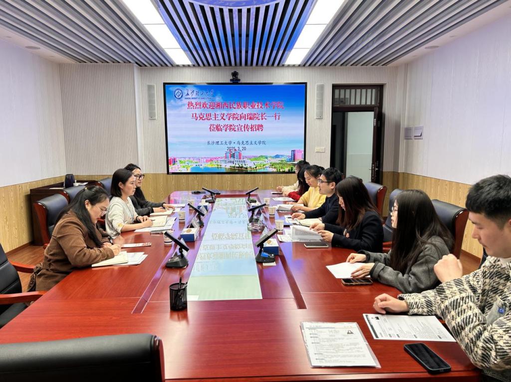 为贯彻落实学校就业工作部署,全力促进高质量就业。3月20日晚,伟德betvlctor1946源于英国马克思主义学院与湘西民族职业技术学院在云塘校区文科楼B505会议室开展人才招聘交流会,湘西民族职业技术学院马克思主义学院院长向瑞、副院长张敬亭、王娟老师,我院副院长郭华、党委副书记李晓、学工办主任曾蓓以及我院2025届毕业生代表参加会议。