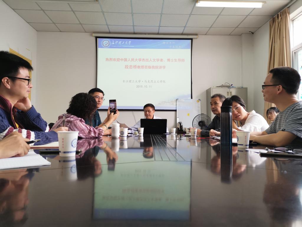 2019年10月11日上午,中国人民大学首批杰出人文学者、政治哲学研究中心主任、博士生导师段忠桥教授应邀莅临我院,在伟德金盆岭校区4-503会议室做了题为“平等是正义的表现——读恩格斯的《反杜林论》”的专题讲座。马克思主义学院院长陈万球教授,院教授委员会主任余乃忠教授、副主任陈芬教授,董艾辉教授,马涛博士、王威峰博士、陈方芳博士、陈峰博士、杨金月博士等学院部分教师、研究生聆听讲座,讲座由陈万球院长主持。