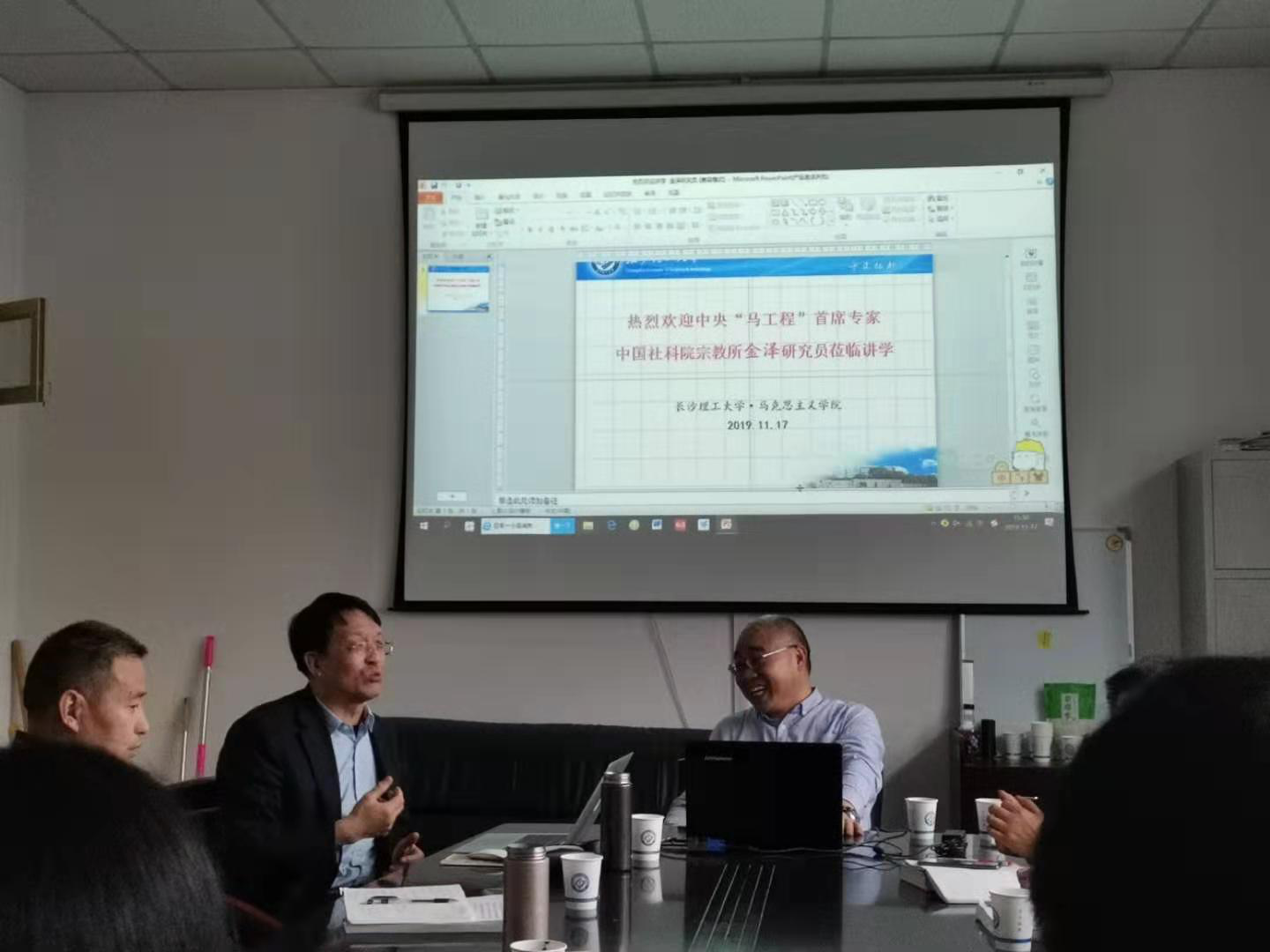 2019年11月17日下午,中央“马工程”宗教学首席专家、中国宗教学会原副会长兼秘书长、中国社科院世界宗教所研究员、中国社科院研究生院宗教学系原主任金泽教授应马克思主义学院邀请,在伟德金盆岭校区4-503室作了题为“宗教与法治”的学术讲座。马克思主义学院教授委员会余乃忠主任,陆群教授、文贵全博士、陈峰博士等部分教师和学院研究生参加了讲座,中南大学于丽娜博士、胡蓉博士、凌昊天博士等校外人员也参加了讲座。本次讲座由余乃忠教授主持。