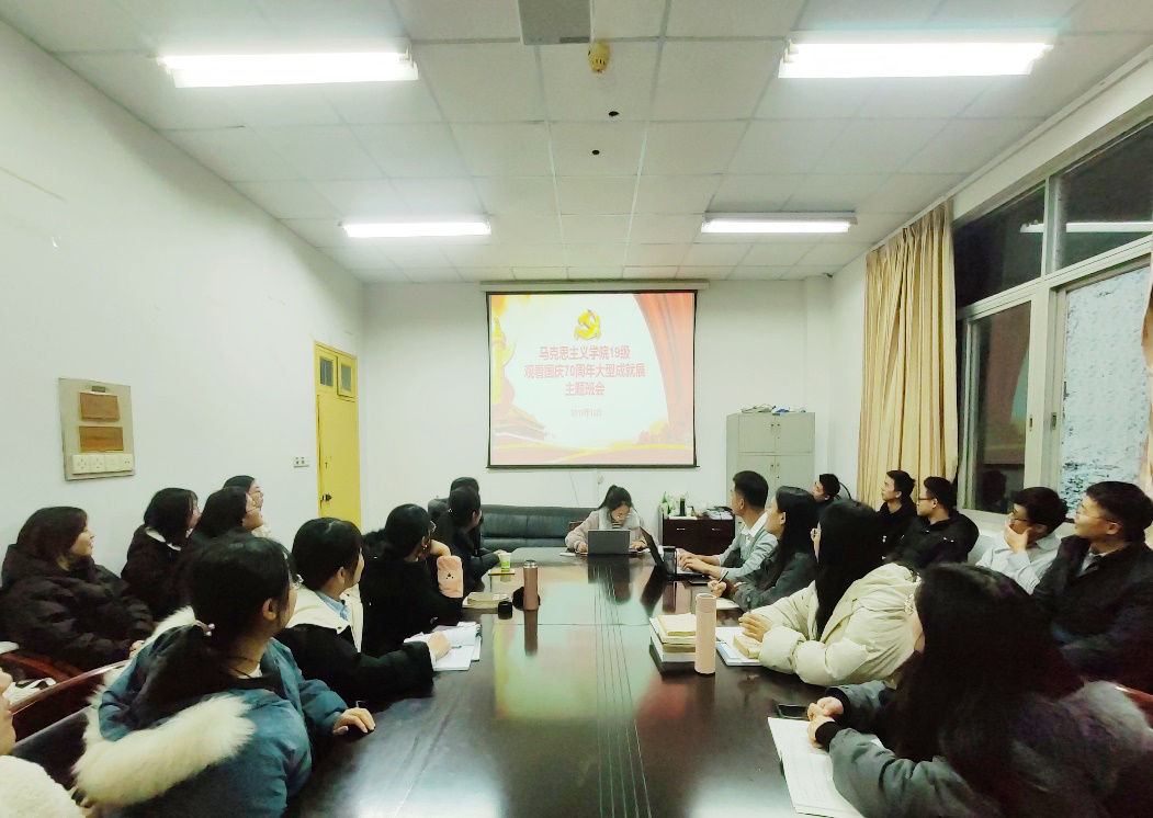 为深入推进“不忘初心、牢记使命”主题教育,12月23日晚7:30-8:30,马克思主义学院2019级研究生在金盆岭校区4号教学楼503室开展了“观看国庆70周年大型成就展”主题班会,深入学习贯彻习近平新时代中国特色社会主义思想,重温70年来中国共产党带领中国人民奋发图强、艰苦奋斗的伟大历程。