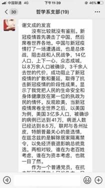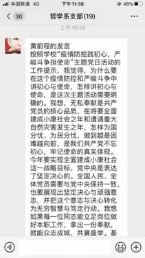 为深入贯彻上级部门关于坚决打赢疫情防控阻击战,做好复工复产复学工作的相关会议精神,5月15日,哲学系支部召开在线“疫情防控践初心、严峻斗争担使命”主题党日活动,会议由支部书记黄前程主持,全体支部党员参加。