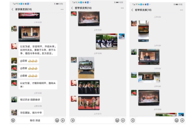9月3日上午,纪念中国人民抗日战争暨世界反法西斯战争胜利75周年向抗战烈士敬献花篮仪式在中国人民抗日战争纪念馆举行,习近平总书记等党和国家领导人同首都各界代表一起出席了仪式。哲学系党支部召开在线“中国人民抗日战争暨世界反法西斯战争胜利75周年纪念日”主题党日活动,全体党员收看直播,并积极留言抒怀。