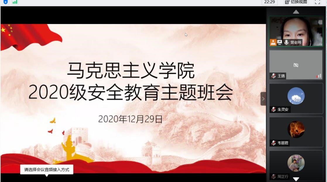 2020年12月29日晚8点,马克思主义学院通过腾讯会议在线上召开了2020级安全教育主题班会,班会由辅导员曾蓓主持,2020级全体研究生参加。