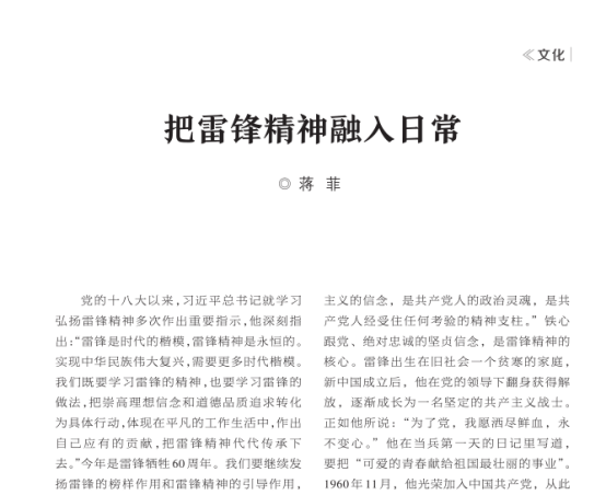 摘要:党的十八大以来,习近平总书记就学习弘扬雷锋精神多次作出重要指示,他深刻指出:“雷锋是时代的楷模,雷锋精神是永恒的。实现中华民族伟大复兴,需要更多时代楷模。我们既要学习雷锋的精神,也要学习雷锋的做法,把崇高理想信念和道德品质追求转化为具体行动,体现在平凡的工作生活中,作出自己应有的贡献,把雷锋精神代代传承下去。”今年是雷锋牺牲60周年。我们要继续发扬雷锋的榜样作用和雷锋精神的引导作用,以强大的中国精神激扬中国力量,以共同的理想信念凝聚民族意志,为实现中华民族伟大复兴提供更加有力的思想保证、文化支撑和精神力量。