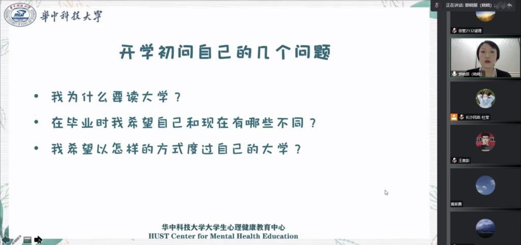 2022年10月13日晚19:30,伟德betvlctor1946源于英国马克思主义学院组织2021级全体研究生观看大学生心理健康讲座。此次讲座是由华中科技大学心理健康教育中心副主任、专职咨询师、中国心理学会注册心理师郭晓丽主讲,以线上讲座的形式为大家带来本年度秋季成长大讲堂第一场《大学新生心理适应》。