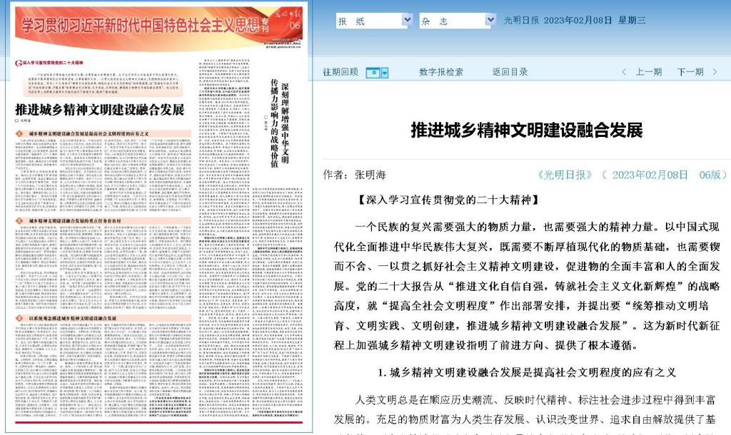 2月8日,《光明日报》“学习贯彻习近平新时代中国特色社会主义思想”专刊刊发我院张明海教授的长篇理论文章“推进城乡精神文明建设融合发展”。此文系张明海教授主持的国家社科基金重大项目“深化拓展新时代文明实践中心建设方法与路径研究”〔21ZDA077〕的阶段性成果。