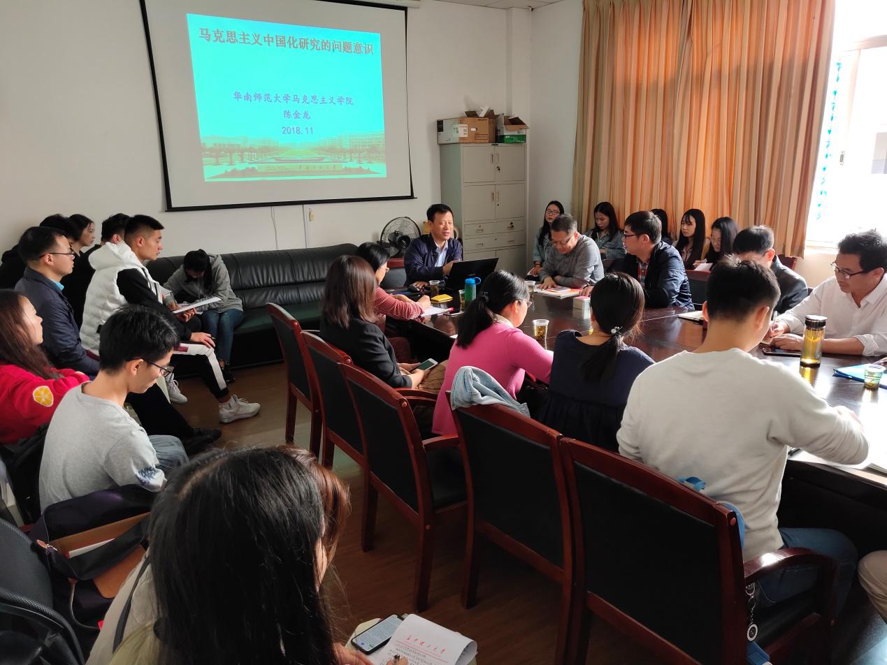 11月4日上午,教育部特聘教授、中央“马工程”首席专家、华南师范大学马克思主义学院院长、博士生导师陈金龙教授应邀来到我院,在金盆岭校区4教503会议室作了题名为“马克思主义中国化研究中的问题意识”的学术报告,学校人文社科处卿定文处长、马克思主义学院张明海副院长、部分教师与研究生听取了讲座,本次讲座由张明海副院长主持。