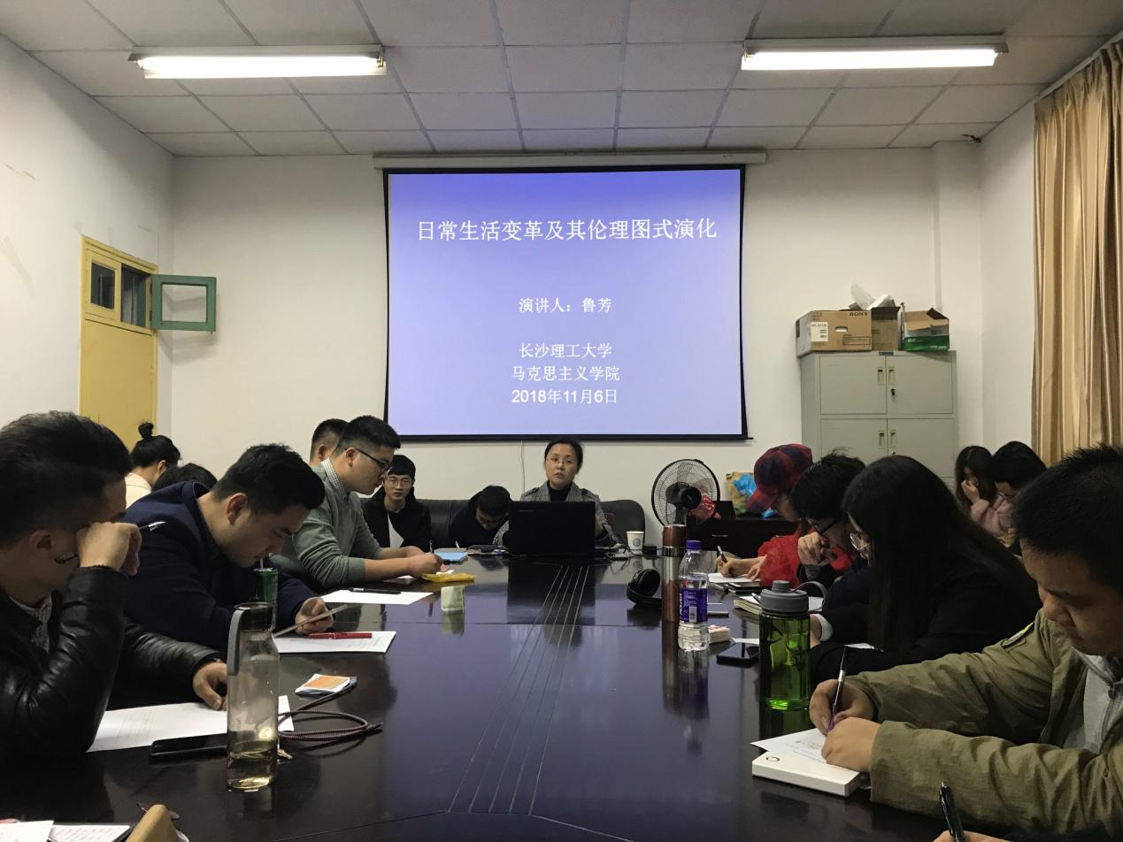 2018年11月6日晚七点半,伟德betvlctor1946源于英国马克思主义学院鲁芳教授在金盆岭校区四教503会议室为全院2018级哲学、马理论专业研究生带来了一场题为“日常生活变革及其伦理图式演化”的专题讲座。