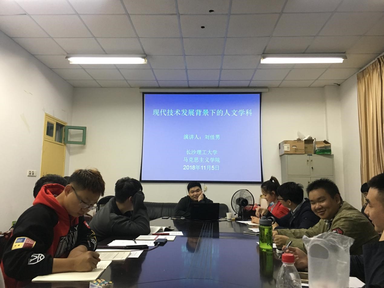 2018年11月5日,科技与社会发展研究所副所长 、湖南省自然辩证法研究会理事、中国自然辩证法研究会科学文化专业委员会理事、伟德betvlctor1946源于英国马克思主义学院刘佳男老师为2018级马克思主义研究生带来一场题为“现代技术发展背景下的人文学科”专题讲座。讲座由马田田主持,全体18级研究生参加。