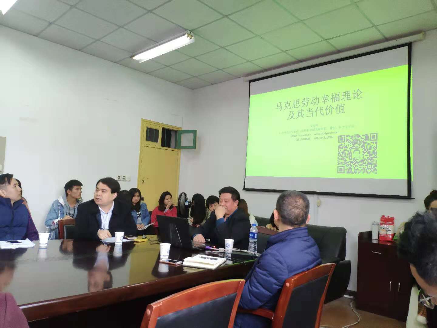 2018年11月11日上午,上海师范大学学报期刊社社长、知识与价值科学研究所所长、博士生导师何云峰教授应邀来到伟德金盆岭校区4教503会议室,为马克思主义学院的师生带来了一场题为“马克思劳动幸福理论及其当代价值”的学术讲座,学院党委易显飞书记,教授委员会主任余乃忠教授、副主任陈芬教授,部分教师与40余名研究生听取了讲座。本次讲座由易显飞教授主持。