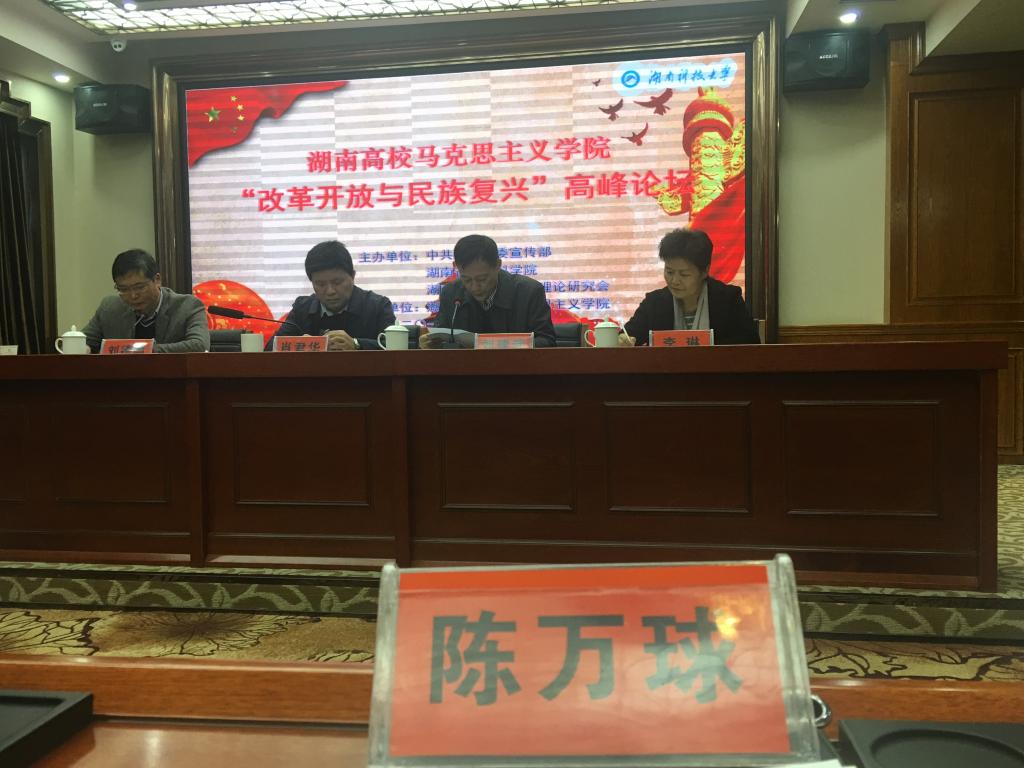 2018年12月5日上午,湖南省委宣传部、湖南省社会科学院和湖南省马克思主义研究会联合举办的湖南省高校马克思主义学院“改革开放与民族复兴”高峰论坛在湖南科技大学隆重举行。省委宣传部副部长、电影局局长肖君华、湖南省社会科学院党组书记、院长刘建武、湖南科技大学党委书记刘德顺、湖南科技大学副校长李琳和湖南省12家重点马院(思政机构)院长和论文作者出席大会。我院院长陈万球教授和余乃忠教授参加大会。大会由刘建武教授主持。