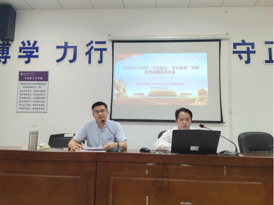 2019年9月19日下午两点,马克思主义学院在云塘校区文科楼C202召开了“不忘初心、牢记使命”主题教育部署大会,会议由梁建新副院长主持,陈万球院长做重要部署,马克思主义学院全体党员参加。