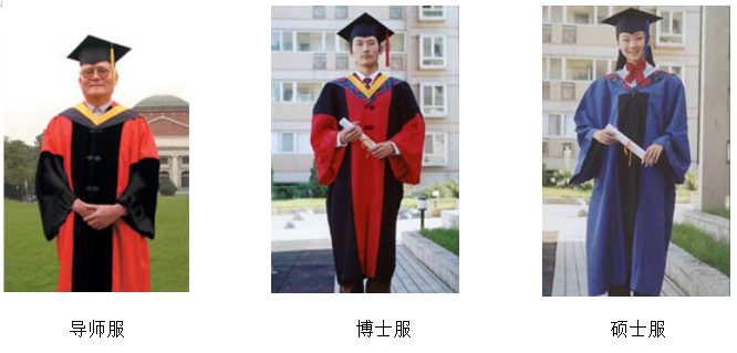 1、博士学位袍为黑、红两色,硕士学位袍为蓝、深蓝两色,校长服为红、黑两色。