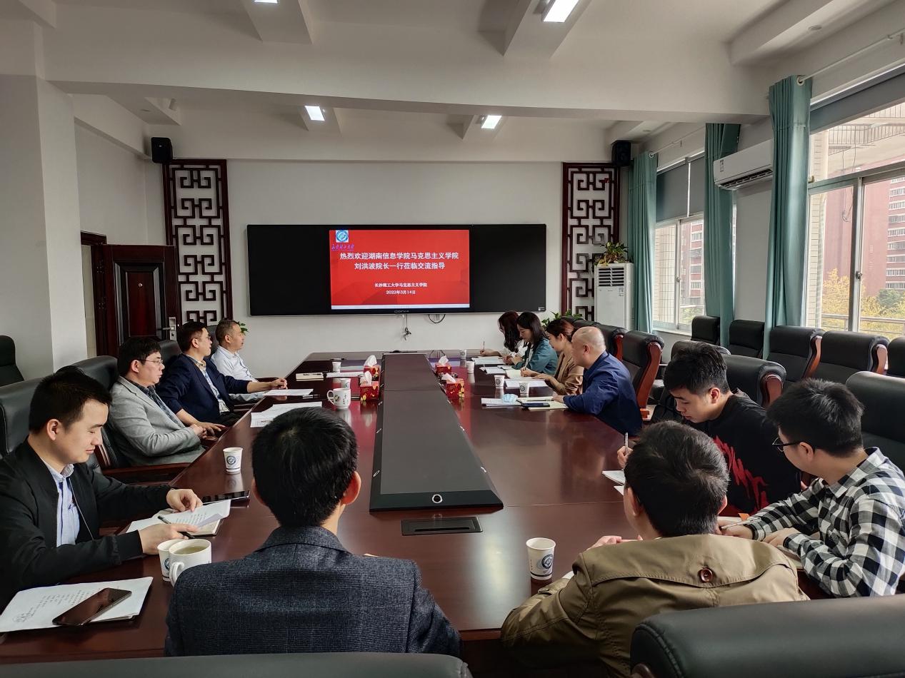 陈万球院长首先代表学院对刘洪波院长一行的到来表示热烈欢迎,并对学院基本情况和近年来取得的各项成果做了简要的报告。刘洪波院长详细介绍了湖南信息学院马克思主义学院的基本情况和学院的办学特色,并展望了学院在教学、科研、学科建设等方面工作的着力点。