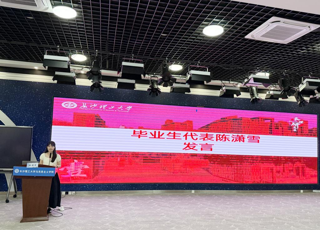 接着,2025届优秀毕业生代表陈潇雪发表毕业感言。她代表全体毕业生向精心培育他们的学院领导、老师表达了衷心的感谢和崇高的敬意,也向陪伴自己求学、成长的同学们表示感谢。她特别提到马克思主义理论中的“螺旋式上升哲理”让她在挫折中学会坚韧、在探索中明晰方向,从青涩学子成长为善于用理论关照现实,推动实践进步的追光者。在即将告别母校之际,她祝愿学院发展蒸蒸日上、再创辉煌,也祝同学们前程似锦,未来可期!