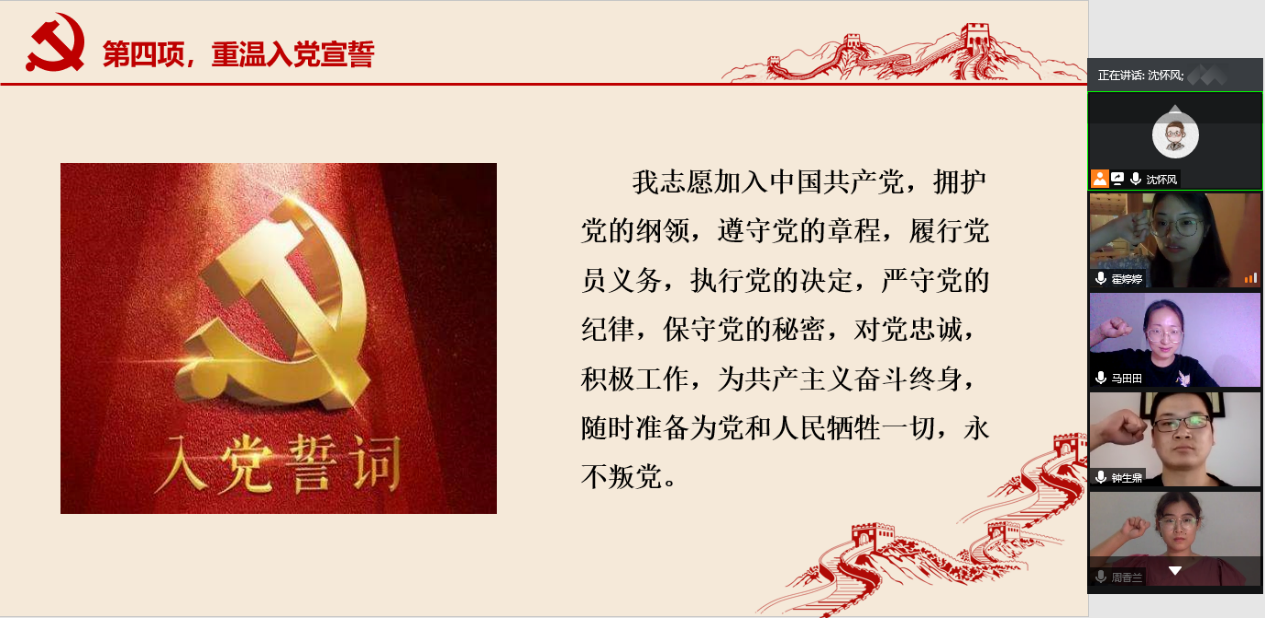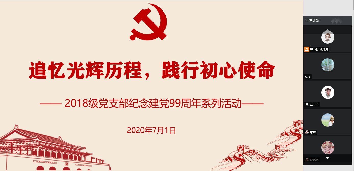 2020年7月1日晚,马克思主义学院2018级研究生党支部通过腾讯会议平台,开展了“追忆光辉历程,践行初心使命”庆祝中国共产党成立99周年的主题党日活动。本次活动由支部书记沈康主持,全体党员参加。