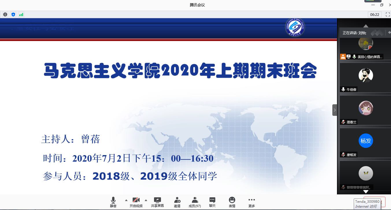 2020年7月2日下午3点,马克思主义学院通过腾讯会议召开2020年上期期末“云”班会。此次会议由辅导员曾蓓老师主持,2018级、2019级全体硕士研究生参加。