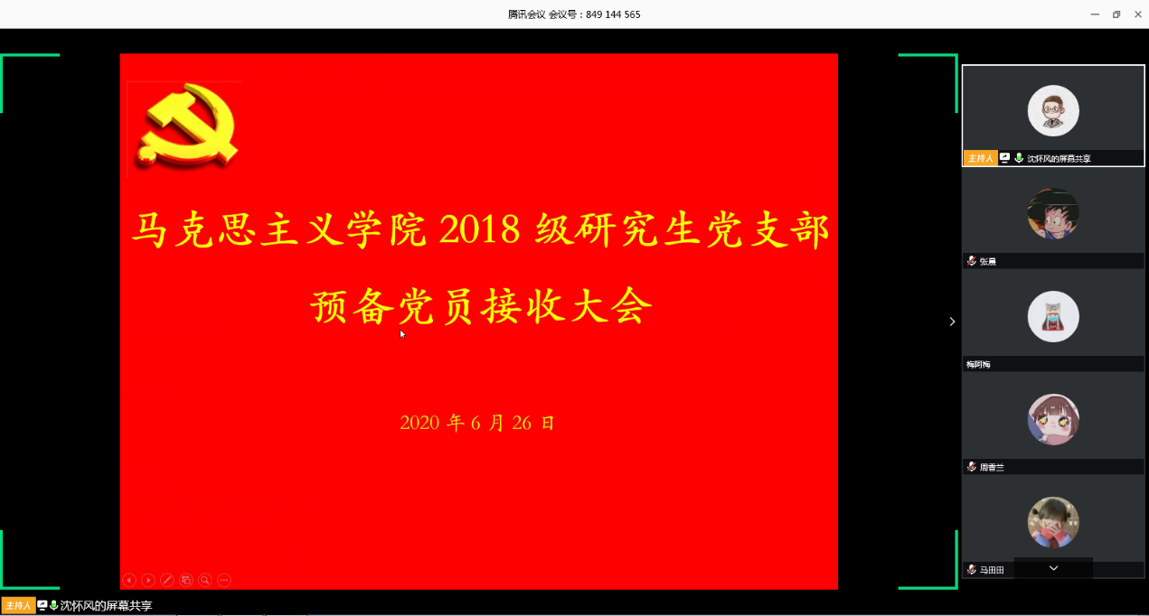 2020年6月26日晚,马克思主义学院2018级研究生党支部通过腾讯会议平台召开了预备党员接收大会,对是否接收张晨等八位发展对象成为中共预备党员进行了讨论与表决。会议由支部书记沈康主持,支部全体党员参加。