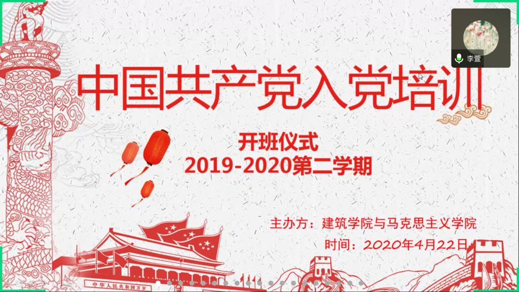 为切实做好党员发展工作,不断壮大党员队伍,充分发挥共产党员的先锋模范带头作用,马克思主义学院、建筑学院于2020年4月22日晚7点通过腾讯会议直播平台举行了2020年上期党校开班仪式。建筑学院党委书记丁力、建筑学院党建辅导员周芳、马克思主义学院党建辅导员曾蓓出席了本次开班典礼,本次开班仪式由建筑学院李萱同学主持,马克思主义学院、建筑学院全体入党积极分子、发展对象、预备党员培训班学员参与。