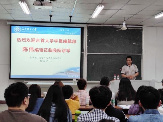 10月13日晚7时半,为帮助我院研究生熟悉论文写作要领及投稿要求与技巧,自觉遵守学术规范和学术道德,马克思主义学院特别邀请了吉首大学学报编辑部陈伟编辑来到金盆岭校区4教209室,为我院研究生作了题为《学术论文写作与投稿》的讲座。陈万球院长、李雨燕副院长、陆群教授、郭华副教授、文贵全博士、曾蓓老师等学院老师及2020级全体研究生参加了本次讲座,本次讲座由陈万球院长主持。