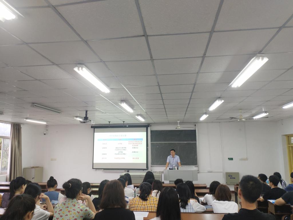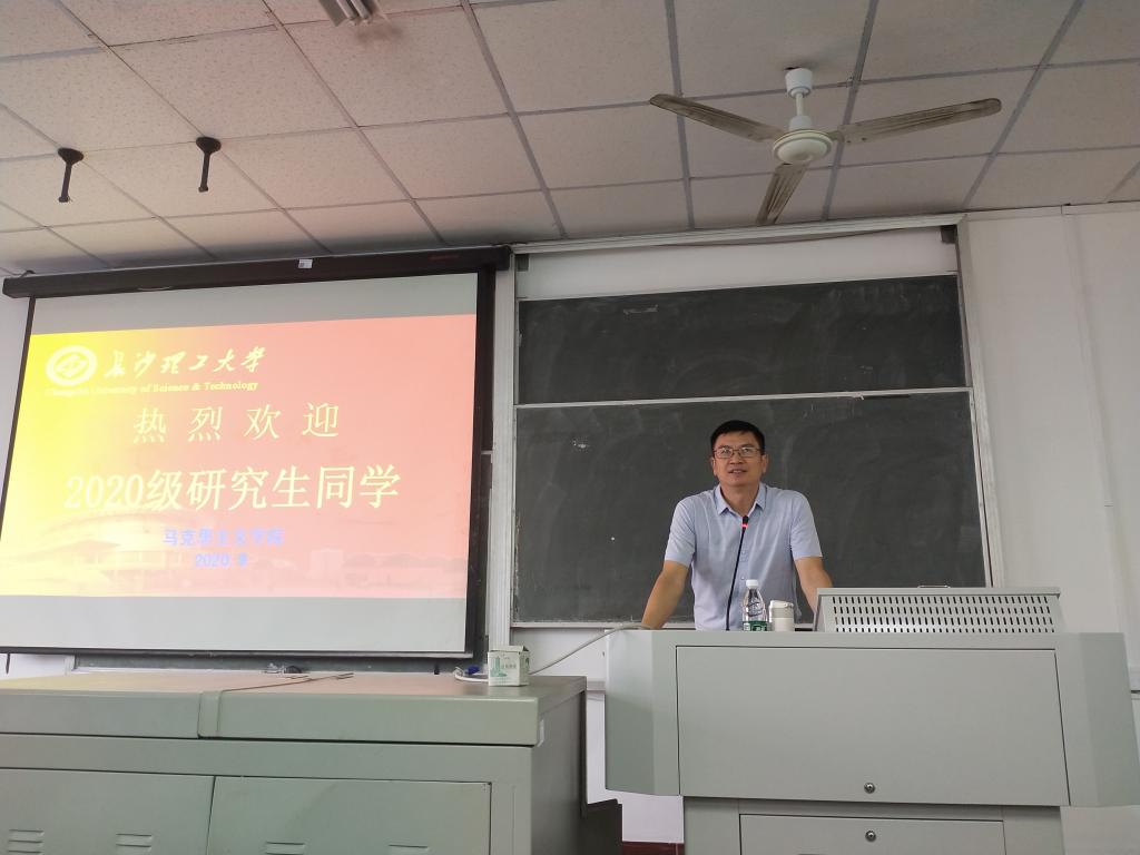 9月16日上午九点,马克思主义学院2020级研究生开学第一课在金盆岭校区4教410举行。马克思主义学院院长陈万球首先表达了对2020级研究生同学的热烈欢迎,接下来从马克思主义学院简介、贯彻学习研究生教育会议精神、何为研究与研究生、学术研究的要素与方法、学术道德的坚守与弘扬这五个方面向新生介绍了我院的基本情况。