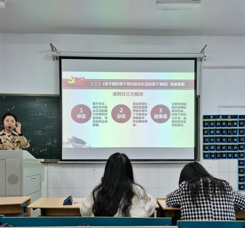 2020年11月20日19:00,马克思主义学院2020年下期发展对象培训班开展第五次党课在金盆岭校区16教313教室正式展开。本次党课由马克思主义学院鲁芳老师主讲,内容为《关于新形势下党内政治生活的若干准则》,马克思主义学院和建筑学院联合党校发展对象培训班全体学员参加了此次课程。