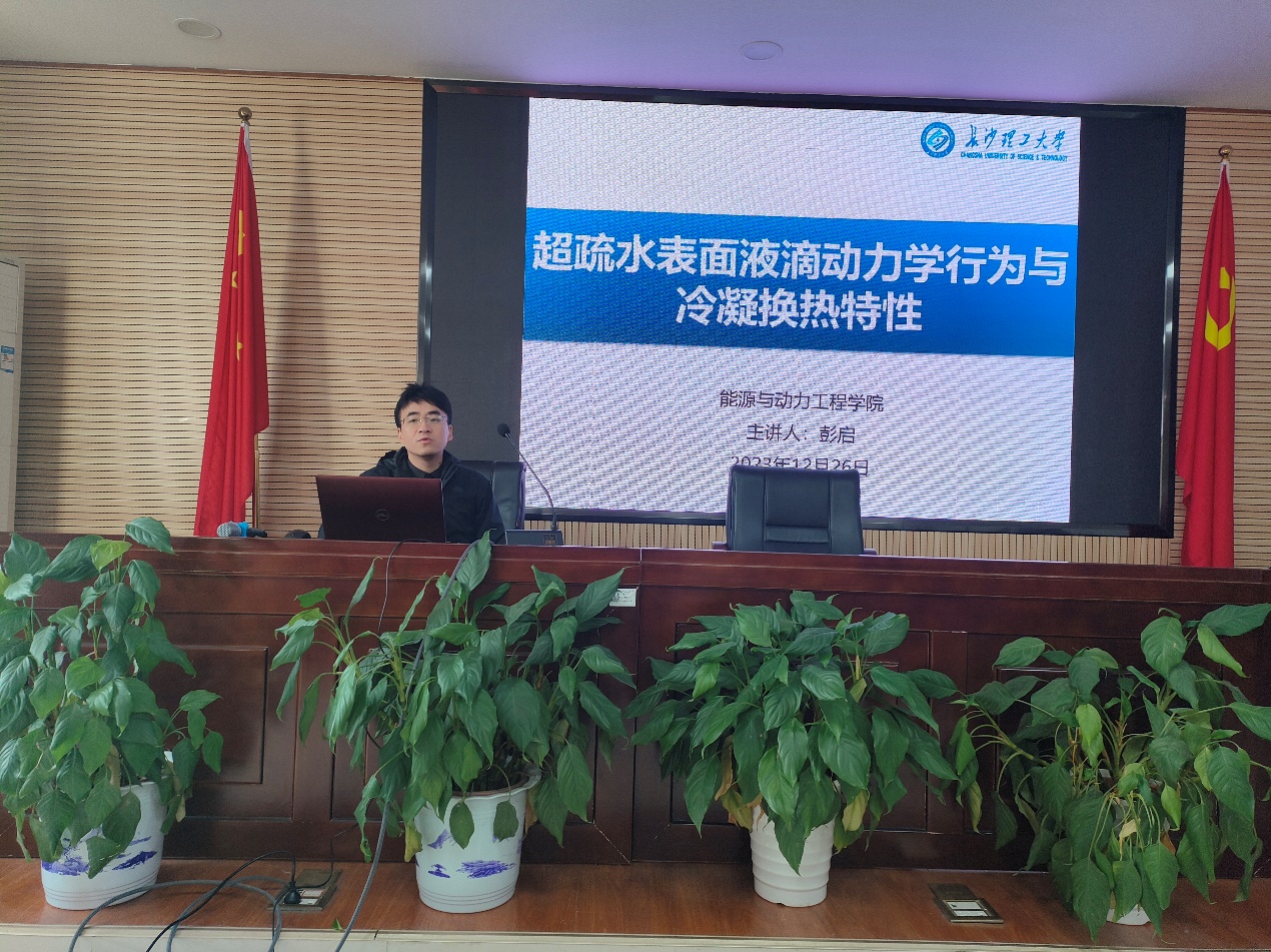 彭启博士做题为 “微纳米结构超疏水表面液滴动力学行为与冷凝换热特性”的报告。受液滴润湿模式的影响,超疏水纳米结构表面冷凝存在弹跳、滚动和滑动三种液滴脱落模式,研究液滴在纳米结构表面的润湿行为对减小液滴脱离尺寸,促进冷凝液滴脱落,进而强化滴状冷凝传热有着重要意义。