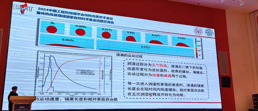 会议期间,我院师生围绕传热传质领域相关问题与来自全国各地的专家学者进行深入的学术探讨和交流。研究生刘明锐和朱龙云分别作了题为“柜式全氟已配灭火装置的小孔喷放雾化与汽化性能数值分析”和“润湿梯度表面气流诱导的液滴定向输运的数值模拟研究”的会议论文报告。
