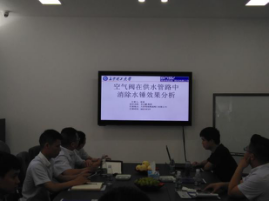 随后在办公楼二楼会议室,双方进行了交流。李志鹏教授首先介绍了消能锥形阀的应用场合、特点以及相关参数的测量与计算,并且着重介绍了消能锥形阀的使用效果;研究生张明对空气阀的进排气特性以及结构优化进行了介绍,研究生徐放对空气阀在供水管路中消除水锤效果进行了介绍。交流期间,双方人员不断对交流内容进行提问和解答,存疑的地方也积极地表达自己的观点。