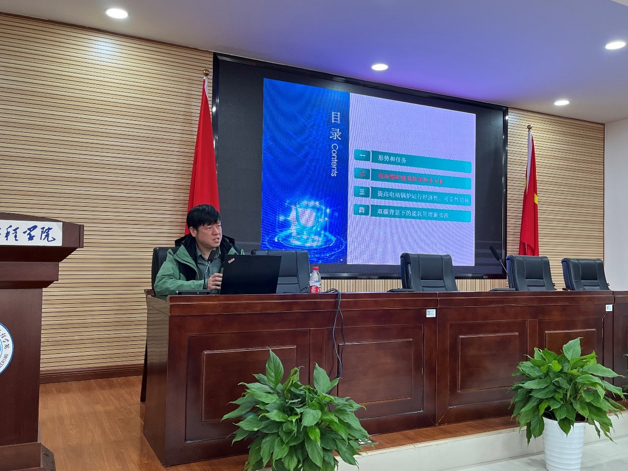 宾谊沅高工长期从事电站锅炉调试、试验、检验等工作,为师生带来了“电站锅炉能耗分析及双碳目标下的新实践”的精彩报告,首先分析了目前电力行业面对的形势和任务,然后就电站锅炉能耗影响因素进行了分析,并阐述了提高电站锅炉运行经济性、可靠性的措施,以及在双碳背景下电科院和电网公司所采取的能耗管理新实践,为我院师生带来了重要的科学技术实践资讯和前沿的行业动态。讲座后宾谊沅高工与师生就传统能效提升、节能技改、智慧电厂或大数据平台突破亟需解决的几个关键问题展开了深入的交流和探讨。