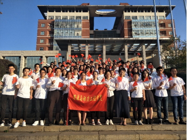 上午7:00的图书馆前坪,沐浴着朝阳,全体师生整装肃立。国旗班的成员迈着整齐的步伐,护送着五星红旗进场。在庄严雄壮的国歌声中,鲜艳的五星红旗冉冉升起,全体师生高唱国歌并向国旗行注目礼。仪式后,师生一齐挥舞着手中的五星红旗,深情地唱响《我和我的祖国》。“能人辈出,动力十足!祖国万岁!祝祖国繁荣昌盛!”嘹亮的口号响彻整个校园。
