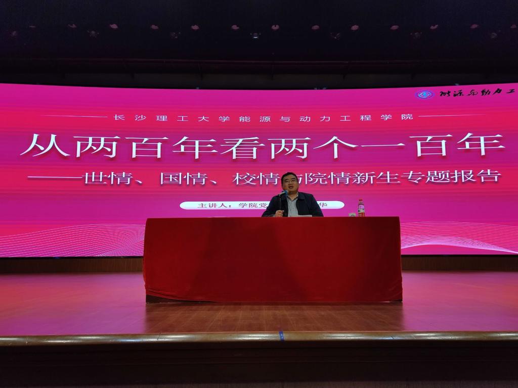 12月9日晚上,能动学院在金盆岭校区五教大礼堂组织“从两百年到两个一百年——世情、国情、校情、院情新生专题报告”,主讲人为学院党委书记成华,能动学院2021级全体新生、学工办全体成员参加本次学习,活动由学院党委副书记张晓烽主持。