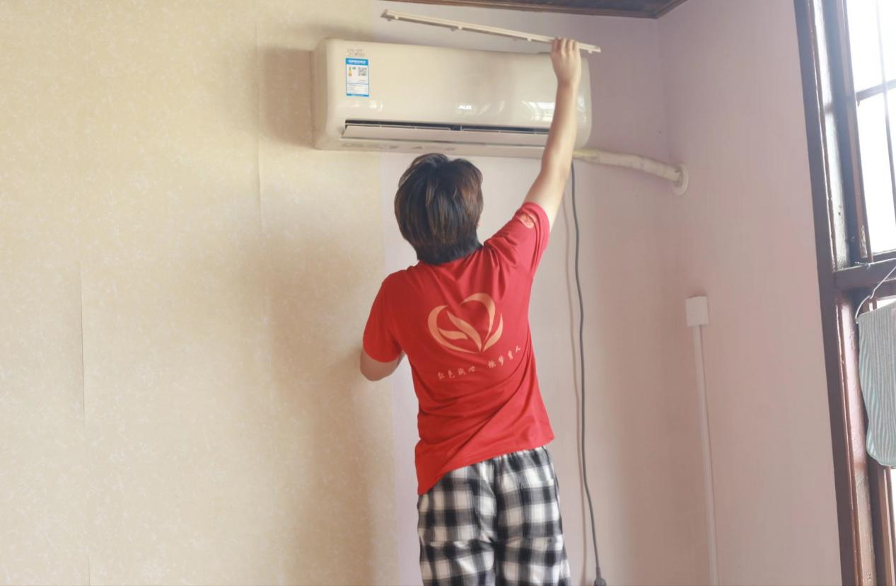 夏日炎热,空调的使用频率增加,但空调经过长时间的闲置,内部已经沉积了大量的灰尘,澎湖村村民大多没有意识到按时清洗空调的重要性。为此,“红烛”团队走进居民家中将专业所学运用到生活实践之中。
