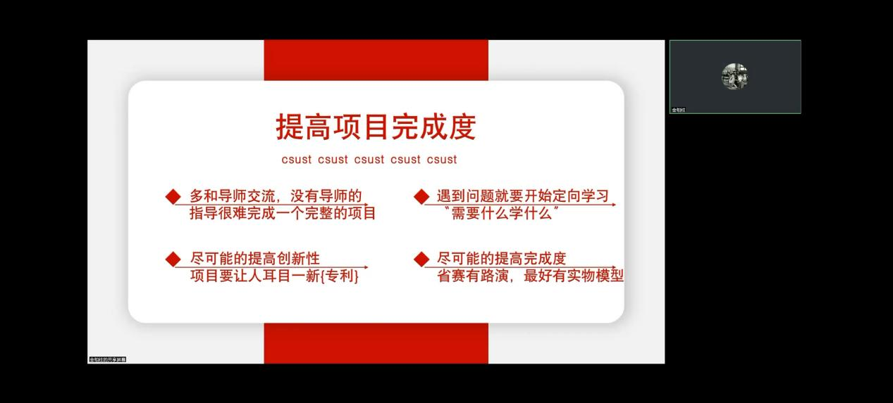 随后,能动2101班陈星炎同学简要阐述了目前可参加的竞赛清单和参加竞赛必备技能的路径,能卓2101班金相柱同学从竞赛的一个“点子”出发再一步一步概述竞赛的整个流程,如组队、提高项目完成度等等,新能源2002班欧阳帅同学主要介绍了竞赛的时间安排和参赛作品主题的注意事项。