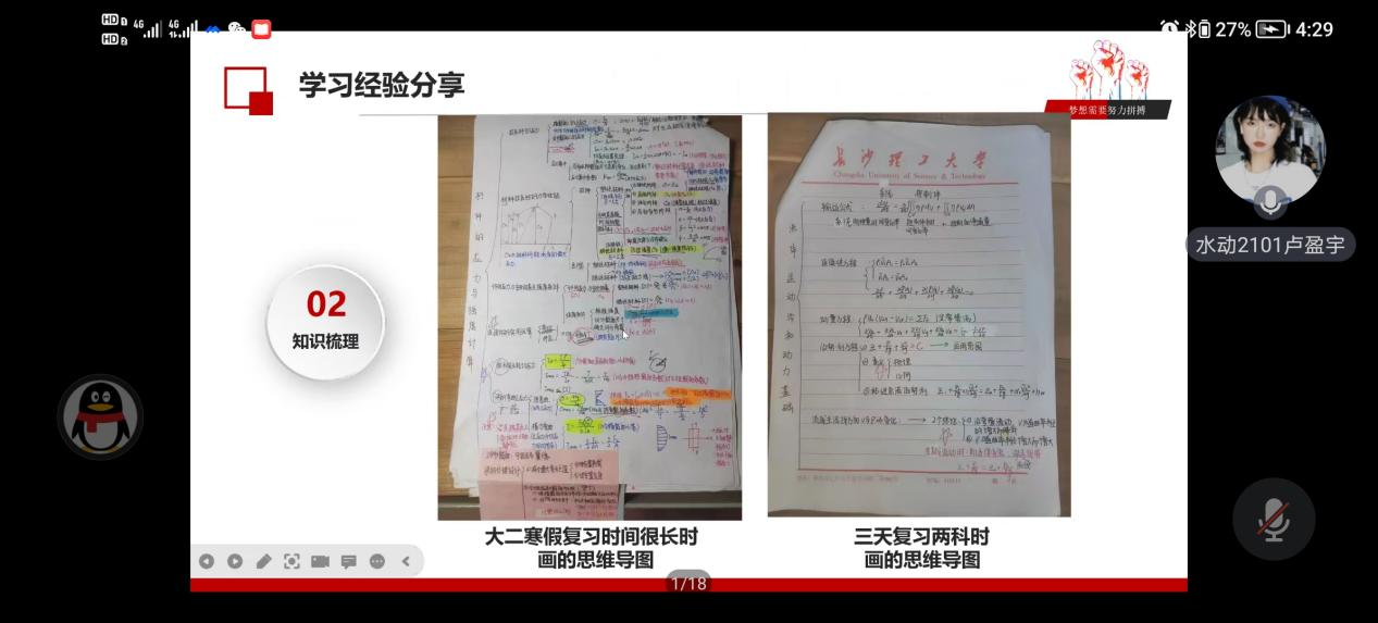 会议伊始,能动2202班林慧欣同学从课本到错题再到学习兴趣的培养,逐一分享了自己学习《高等数学》的有益经验,能卓2101班黄鹏鹏同学从学科的“共享经验”和《工程力学》的“个性经验”入手,分析了通用的学习方法以及该学科特质的学习方法,且总结了该课程的重要知识点,帮助同学们明晰课程重难点。能动2104班卢盈宇同学则从课堂氛围、知识梳理、找重点、解题四个方面详细分享了自己对于《工程流体力学》这一学科的学习心得。