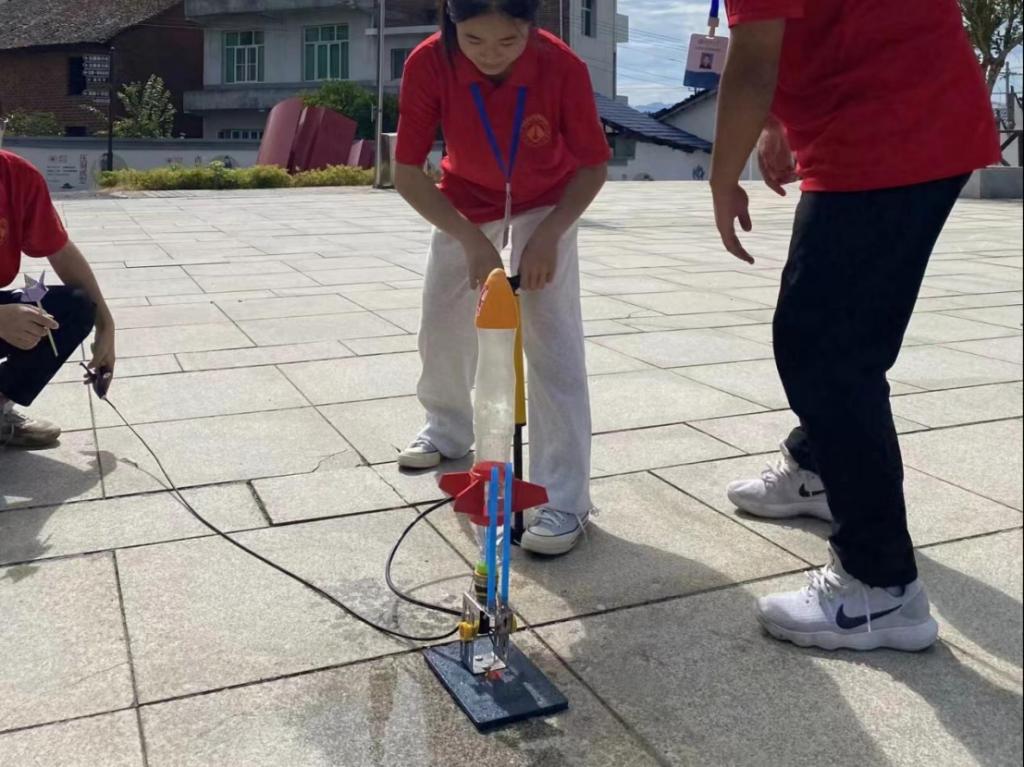 火箭昂首,冲向天空。为了让孩子们见证火箭升空的力量,“红烛”团队还在操场上准备了水火箭的发射装置。
