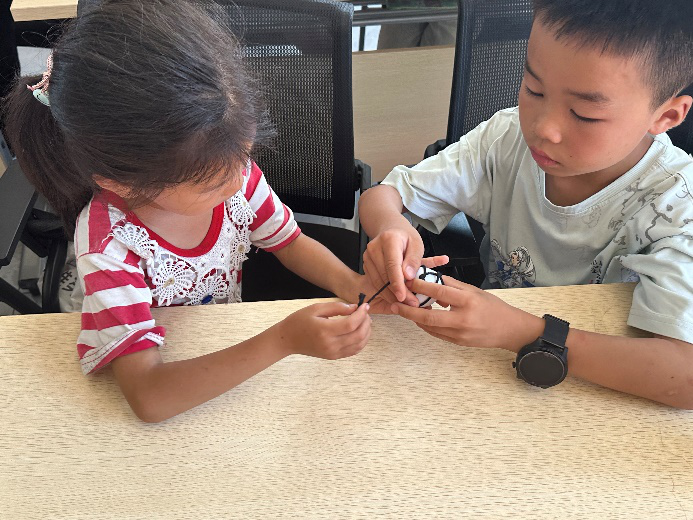 在课程互动环节,同学们积极亲身实践,由易到难地分组进行了球体结及中国结的学习。球体结的教学中,孩子们学会了用绳子将乒乓球美观又实用地捆绑;而在中国结的教学过程中,尽管偶有挫折,但在其他老师的协助下,所有同学最终都成功地编出了属于自己的第一个中国结,孩子们脸上都洋溢着自豪的笑容。