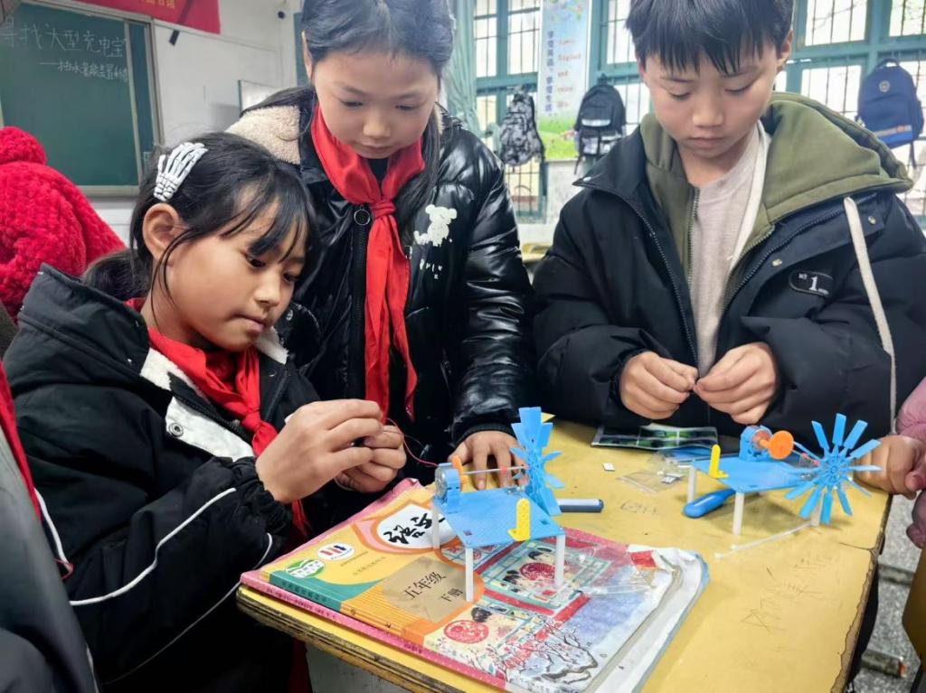志愿者们还设计了科普小实验环节,将小朋友们分成三人一组。分发材料后,一身“开始”,孩子们立马全身心投入到制作中。固定水轮轴套、安装马达、接线正负极、安装LED灯......在志愿者们的引导帮助下,孩子们成功组装出一个个水力发电装置。“原来水往高处流,也能点亮万家灯火!在我亲自动手组装抽水蓄能装置时,我不仅感叹于科技的力量,也更深刻理解了“绿水青山就是金山银山”的生态理念!”参与实验的小朋友说。此外,兴湘集团团委、工会和凤凰县图书馆还精心设计了剪纸、学习用品捐赠、书籍阅读等环节。
