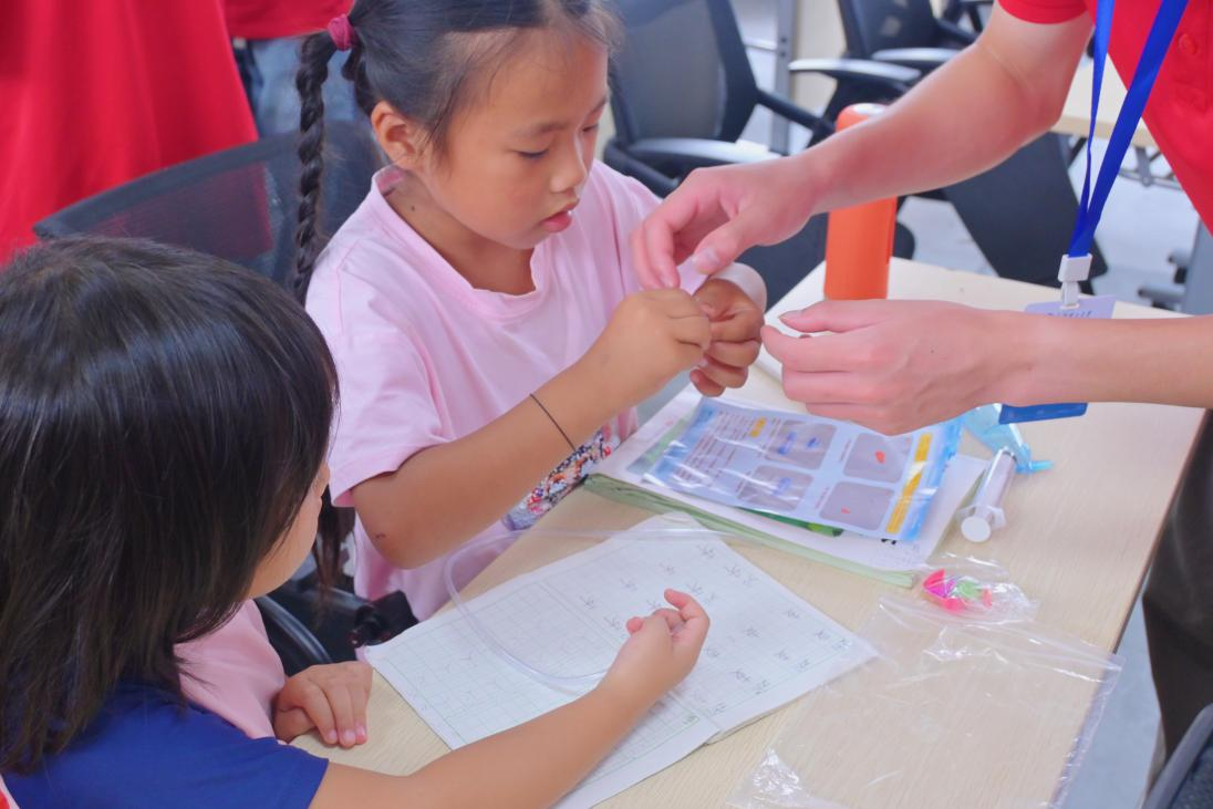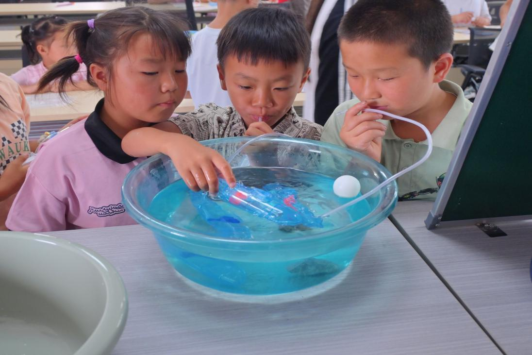 演示结束后,队员们将孩子们分成三人一组,分发了简易潜水艇模型。每组分工明确:一人组装器材、一人进行入水实验、一人观察并描述现象。在队员成员的悉心引导下,孩子们有条不紊地动手实践起来。