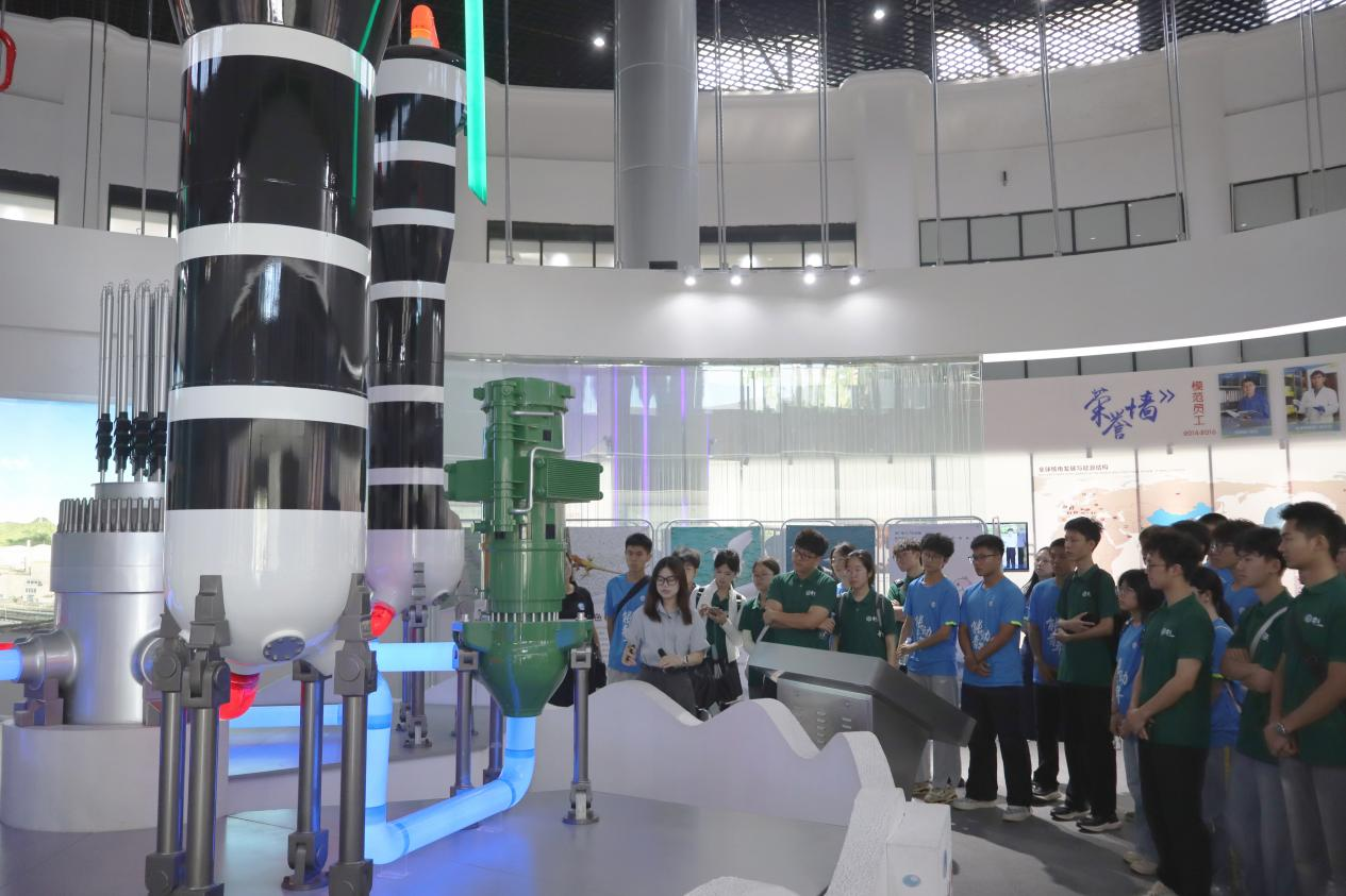 上午,在核电科技展馆讲解员的引领下,同学们系统回顾了世界核能发展波澜壮阔的历史,深刻感受了我国核能事业从无到有、由弱到强的奋进征程。展馆重点展示了阳江核电站的卓越成就,作为一次核准建设六台百万千瓦级压水堆核电机组的国家重点能源项目,阳江核电站不仅实现了废水、废气和固体废物的“三废”零排放,创造了绿色能源的奇迹。通过模拟吸收中子、骑车发电机等互动项目,复杂的核能发电原理转化为可触可摸的实践体验,极大深化了能动专业学子对理论知识的理解。讲解员说,“环境保护是核电建设和运营的重中之重。在阳江核电站周边海域,中华白海豚等珍稀海洋生物依然自由栖息,这正是科技发展与自然生态和谐共生的最佳见证。”