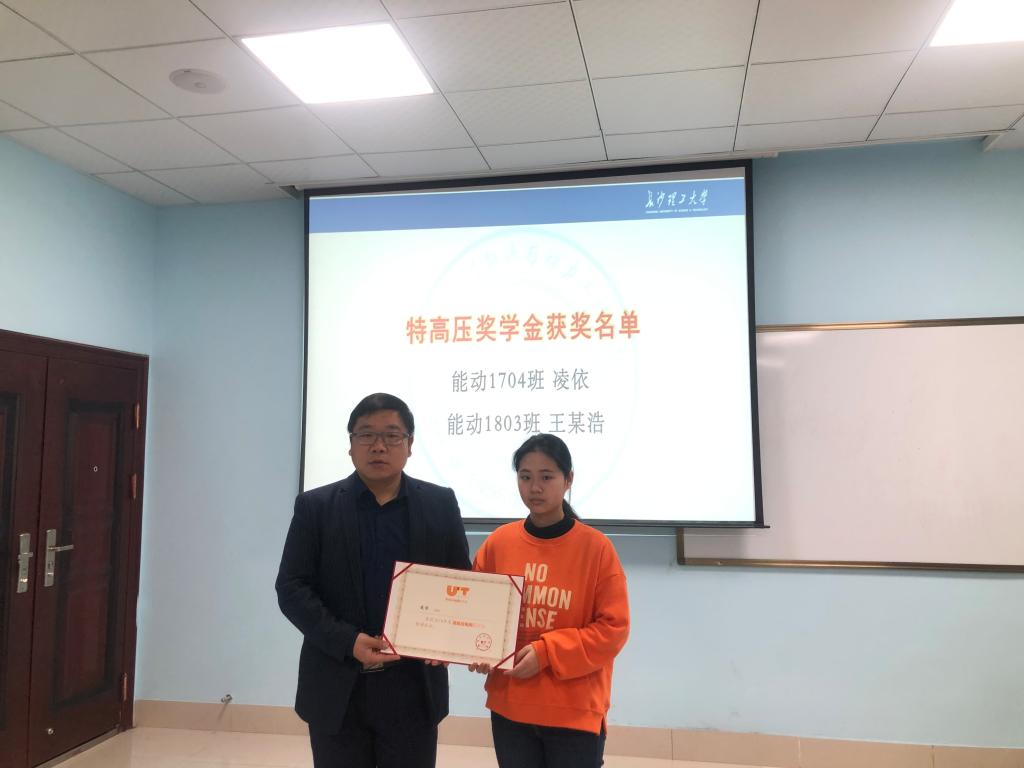 靳攀科向获奖同学表示祝贺,希望能动学子以“特高压电网奖学金”评选为契机,了解我国电力行业的发展历程及前进方向,在追求长理梦、电力梦、中国梦的征程中书写新的壮丽篇章。同时,靳攀科勉励同学们继续在电力领域深入学习为国家电力行业发展作出更大贡献。随后,靳攀科为获奖的两位同学颁发了获奖证书并合影留念。他表示,长期以来国家电网公司等电力行业企业为国家经济建设和社会发展作出了突出贡献。特高压电网奖学金作为全国首个能源行业奖学基金,是电力行业发挥自身优势支持教育事业的实际行动,是促进行业协同、校企合作的积极作为,能动学院将继续积极发挥学科和人才优势,努力为电力行业的发展贡献力量!