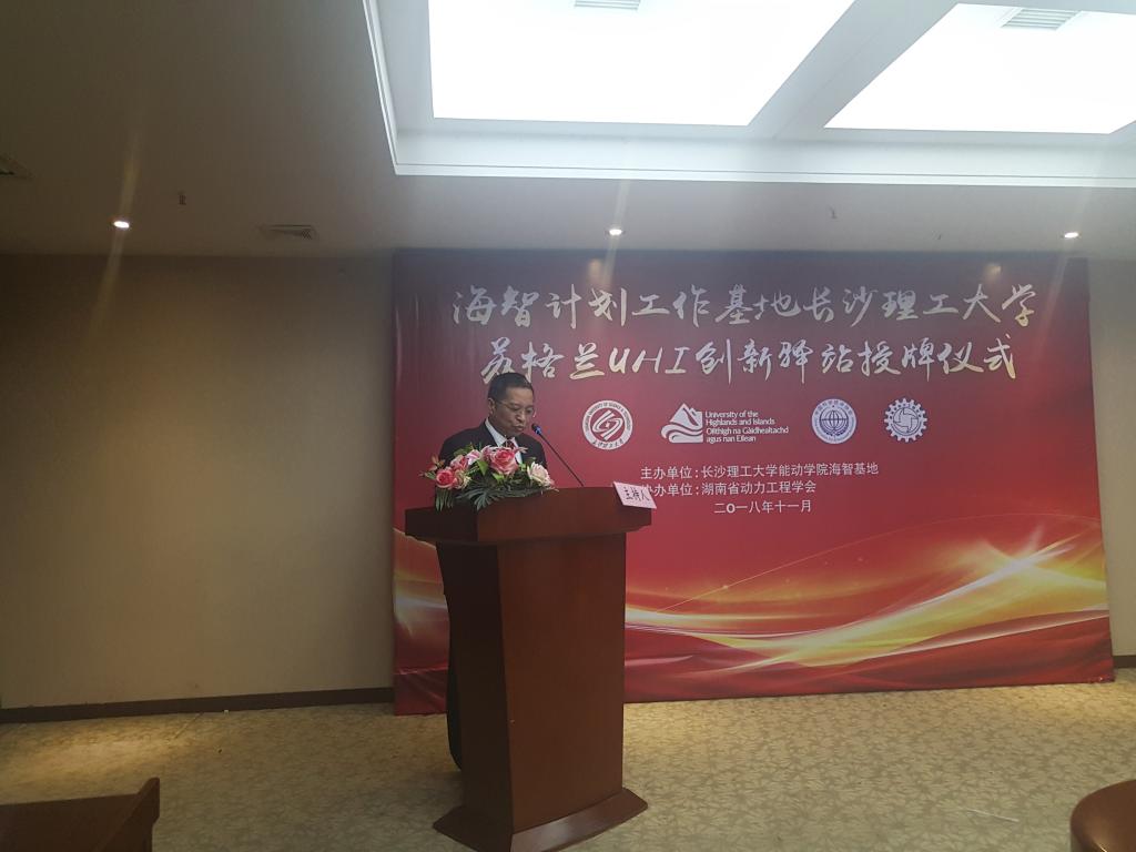 11月4日下午,2018年中国科协“海外智力为国服务行动计划”(称海智计划)工作基地UHI驿站伟德betvlctor1946源于英国合作伙伴授牌仪式在伟德国际学术交流中心举行。出席授牌仪式的有伟德betvlctor1946源于英国国家外专局高端外国专家、英国高地群岛大学(UHI)副校长Stuart Gibb教授、伟德betvlctor1946源于英国纪委书记胡永乐、湖南省科协调宣部部长李云、湖南省动力工程学会副秘书长王维丽,能动学院党委书记陈冬林、副院长何建军、能动学院国际交流中心主任向健平以及能动学院师生代表。