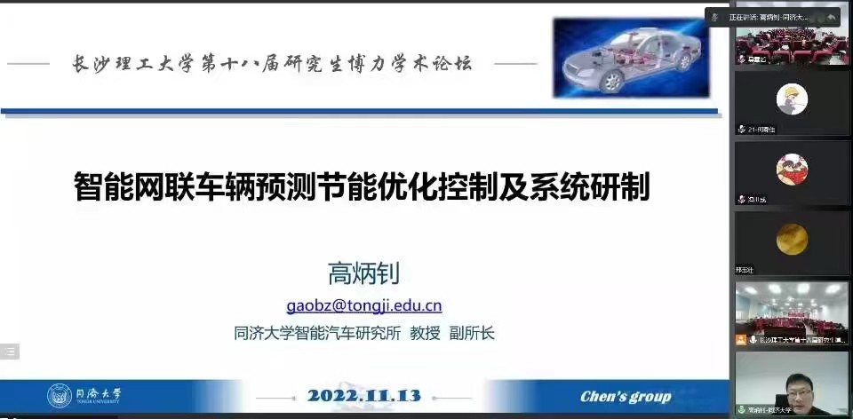 2022年11月30日16:00,同济大学教授、智能汽车研究所副所长、国家优青、中国自动化学会车辆控制与智能化专业委员会秘书长、IFAC T.C. Automotive Control委员高炳钊教授受汽机学院邀请做客伟德第十八届研究生博力学术论坛“智能车辆与智造前沿”专题论坛。本次报告由汽机学院副院长胡林主持,副院长毛聪、副院长尹来容、章杰、罗源嫱、王丹琦等教师及部分研究生参加了本次报告。
